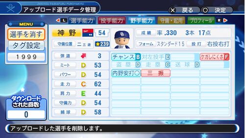 風の子 最近だと韓国代表の李政厚の父親として有名ですかね。 1999年成績 .238 9本 33打点 24盗塁 チャンスF .193 対左投手A .315 走塁D 成績的にはCなんですが暴走があるので1ランク低く。 チームプレイ× デフォのバント〇と共存しているのが気に入ったので…