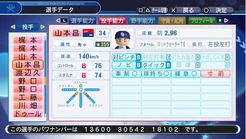山本昌は 胸を張り 1999年成績 防御率2.96 8勝5敗 116奪三振 158.1投球回 球種別成績(球種、推定結果球割合、推定被打率)ストレート 46% .208スクリュー 33% .266カーブ 15% .199スライダー 14% .249 対ピンチB 得点圏被打率.208 対左打者E 右.236左.277 …