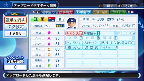 打撃 当時はかなり打低だから盛り盛り。 走力 内野安打や盗塁から高めに。 守備 守備得点がね。 チャンスF 打点が少ない。 対左投手B 29本中9本が左投手から。当時左投手は全体の5分の1程だったので、単純計算でほぼ倍のペース。 ケガしにくさD この年ま…