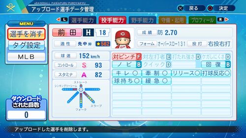 パワナンバー:11500 80958 37383 コントロール 66.2イニングで四球10、死球暴投0、歴代2位のWHIP0.75の安定感。 スラーブ 本人談と変化から。 フォーク 握りも変化もチェンジアップよりフォークのほうが近いと思う。実際一部でスプリットとして扱われている…