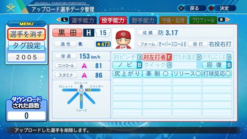 パワナンバー:11500 81076 31646 データは以下を見てください。 ほのかのへや(得点圏、満塁、変化球) - nf3 - Baseball Data House Phase1.0 2005年度版(対左、イニング別、打球方向) 低め○ 落ちる球を低めに制球良く集めるピッチング。