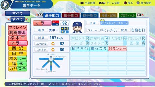 パワナンバー:12500 40685 86236 球速 98mph(≒157km/h)出したのは去年で、今年はフォームを変えたせいか95.7mph(≒154km/h)までしか出なかった。けど来年出るかもしれないしどうせならと157で作成。 コントロール 今年の与四球率だけならBでもいい。た…
