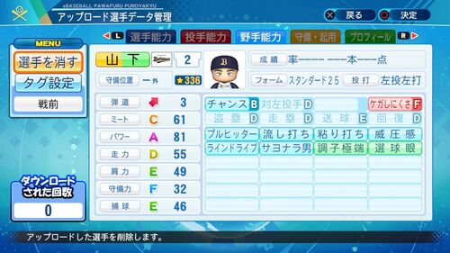 パワナンバー:11400 90159 17926 KONAMIの嫌がらせで背ネームが変わってしまっているので各自修正お願いします。 対左投手F 左投手が苦手らしい。 対変化球×欲しい。